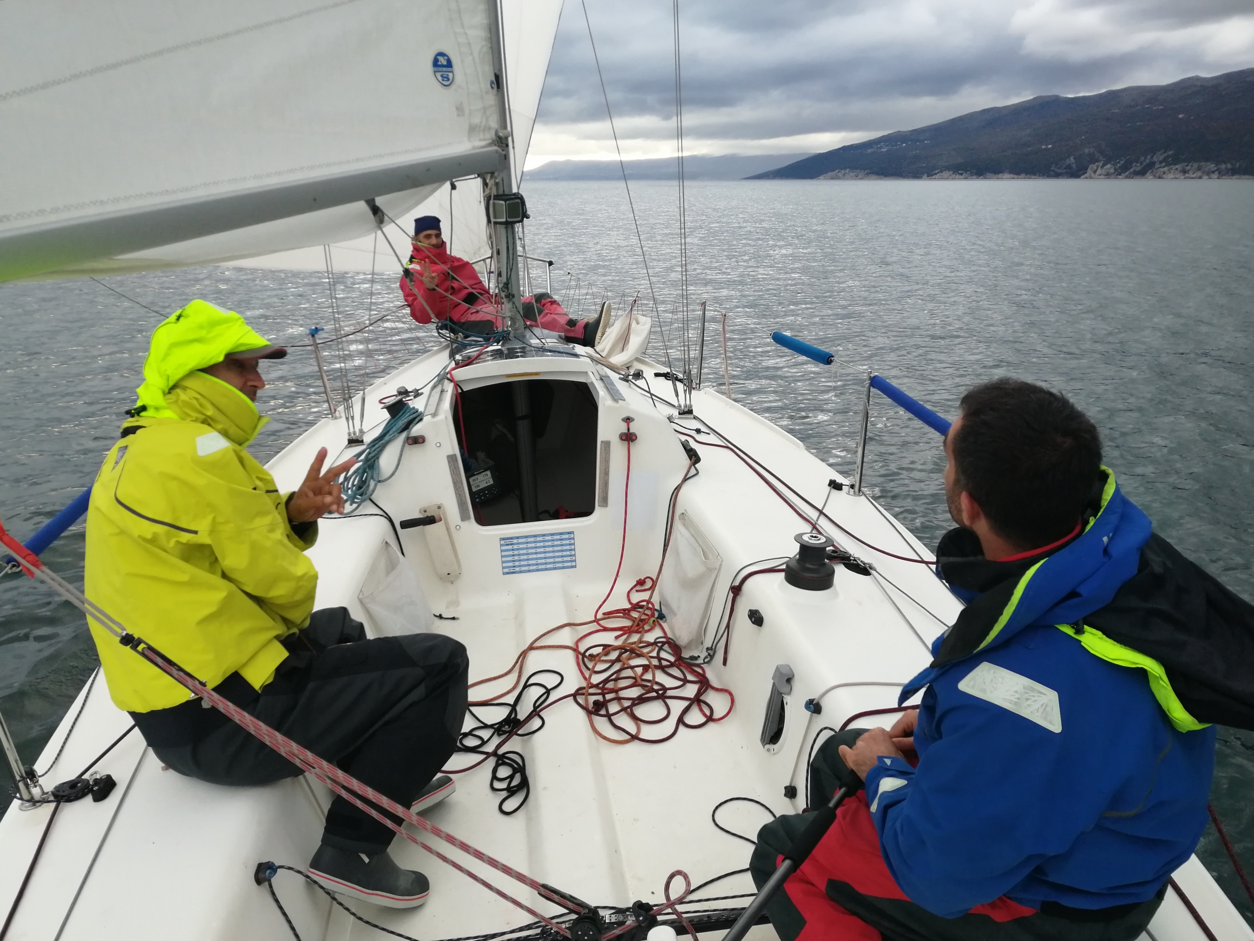 It was in February that I saw the NOR for the Susak race, and I immediately liked it. It's not far, it's happening in November so the weather should be good enough and there's the option of going double handed or fully crewed. We decided to go fully crewed just a few days before the race as the forecast showed decent SE winds which Eloa handles better with some weight on the rail. So I phoned Gilberto aka Gigi, Slobodan aka Dado and Ivan aka Coniglio and we were ready. I transferred Eloa to Icici, the starting point of the race. This was the first edition and the course was supposed to take us from Icici, around Susak and back. Alltogether some 100 NM. Winds were forecasted light in the beggining and getting heavier as we approach Susak. And so it was - we started on November 22nd at 10 am in 0 knots of wind and 1 knot of counter current. A pretty funny sight to see, boats going backwards away from the starting line. But we managed to get some breeze and Eloa accelerated quickly. Amongst others, there was another J80 sailing doublehanded, a Mini, a Bavaria 38 Match with three generations of sailors onboard, a 40 feet old school racing machine and some JODs 35. The light boats were out first, we know we have to cool our nerves for the first part of the race as the Bay of Rijeka is known for light winds. We sail the shortest route, we knew we are light and with the Code0 we managed to stay ahead. We are battling with "Bella Nostra", the old schooler mentioned earlier. Coniglio is constantly changing from Code to Spi and back and we are happy with our performance. The atmosphere onboard is uber cool, our mood waves are perfectly synced and we are chitchatting all the way.